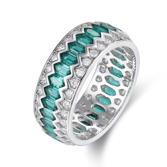 S925 Sterling Silver Emerald Diamond Band – Full Eternity Hexagon Ring – Vintage Art Deco Wedding Band – Green Gemstone Anniversary Ring
