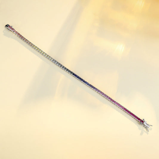 Rainbow Sapphire Princess Cut Bezel Tennis Bracelet S925 Sterling Silver,2mm Multicolor Gemstone Bracelet,Dainty Stackable Tennis Bracelet