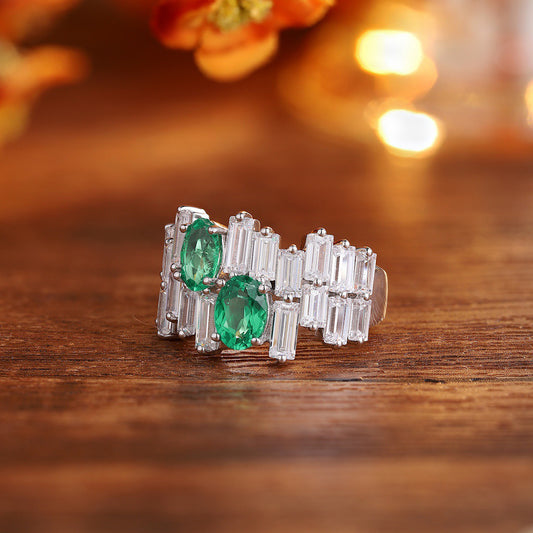 Two Stone Emerald Engagement Ring – Oval Cut Emerald Vintage Sterling Silver Ring – Baguette CZ Cluster Bridal Promise Ring Gift for Her