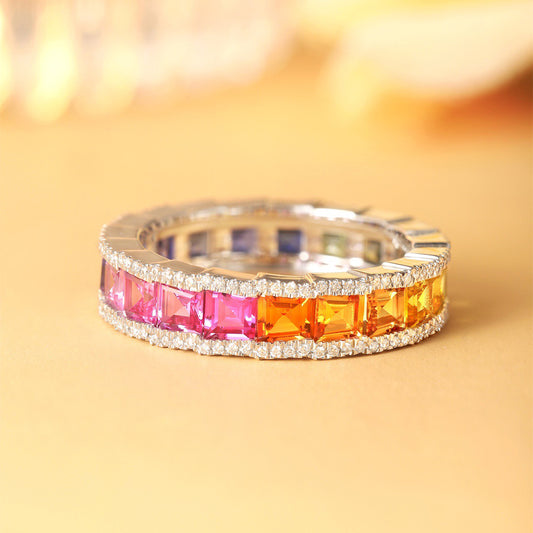 S925 Sterling Silver Rainbow Sapphire Ring – Full Eternity Multicolor Ring – Rainbow Princess Band –Colorful Gemstone Ring for Women