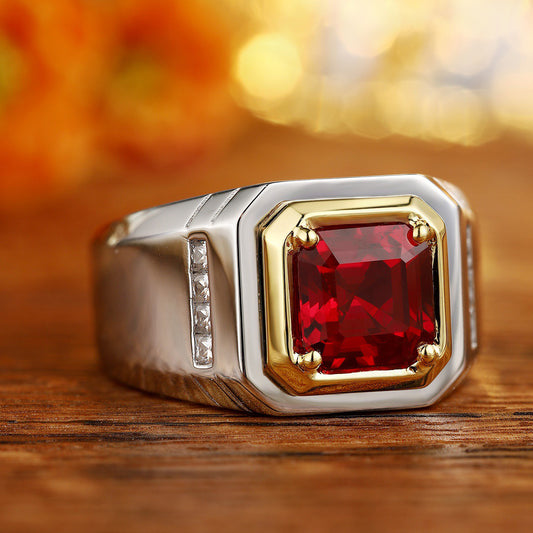 Men’s Lab Created Ruby Ring – S925 Sterling Silver Red Gemstone Band – Men’s Statement Ring Engagement Wedding Ring Gift for Him